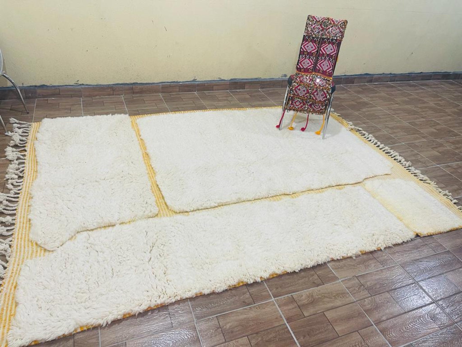 This rug is very soft to the touch because it is made of very soft wool. It looks great because of its bright colors and checkered design.
